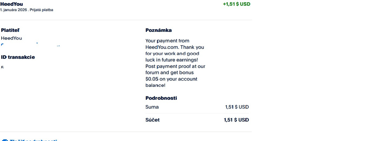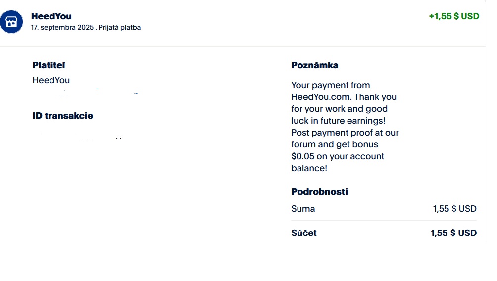 Your payment from HeedYou.com. Thank you for your work and good luck in future earnings! Post payment proof at our forum and get bonus $0.05 on your account balance!